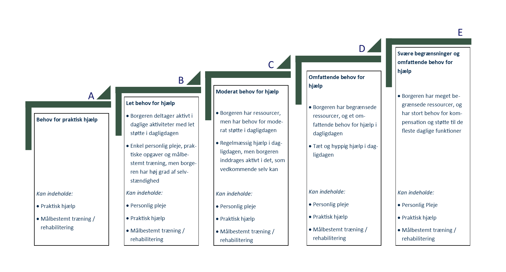 Figuren viser 5 søjler A, B, C, D og E, der illustrerer hver sin forløbspakke med voksende hjælp og støtte som følge af begrænsninger i borgerens ressourcer.